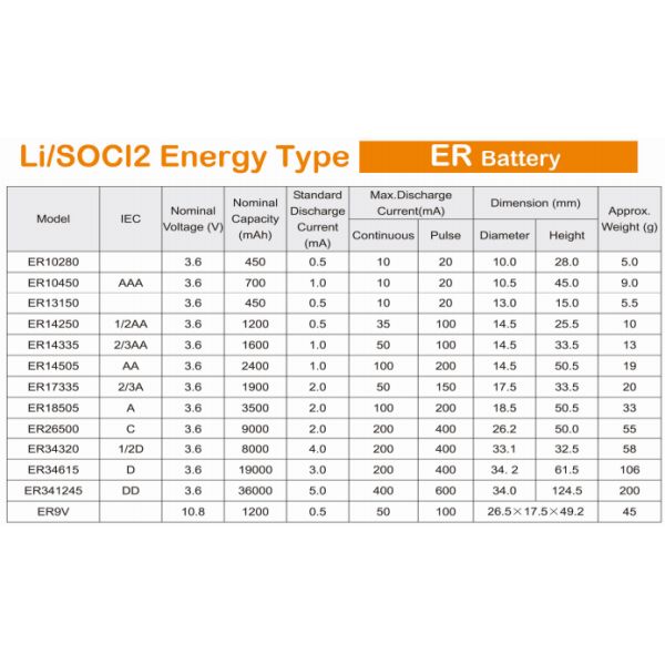 Nominal Voltage : ER10450 3.6V 1Ah